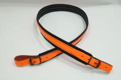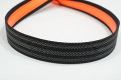 Asehihna mustaa nylonia, oranssilla nahkayksityiskohdalla ja kumitetulla alapinnalla