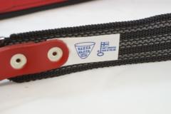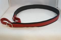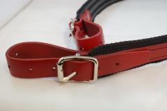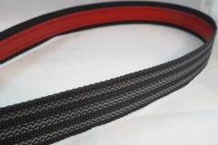 Asehihna mustaa nylonia, punaisella nahkayksityiskohdalla ja kumitetulla alapinnalla