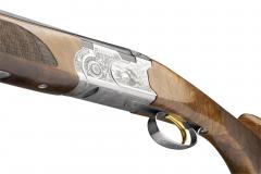 Tyylikkäät metsästysaiheiset, moderneilla kukkakuvioilla ryyditetyt kaiverrukset toistavat Berettan mestarikaivertajien luomaa teemaa ja ulottuvat lukonkehyksen pohjaan saakka, josta löytyvät myös haulikon mallimerkintä ja Beretta-logo.