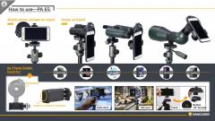 VEO PA-65 toimii universaalina adapterina, joka kiinnittyy useimpiin kaukoputkiin, kiikareihin ja monojalkoihin. Säädettävä rakenne mahdollistaa tarkan linjauksen eri kameralinsseille, joten saat teräviä ja laadukkaita kuvia vaivattomasti. Adapteri voidaan kiinnittää suoraan jalustaan tai monojalkaan 1/4"-20 kierteellä, mikä lisää vakautta kuvaukseen.